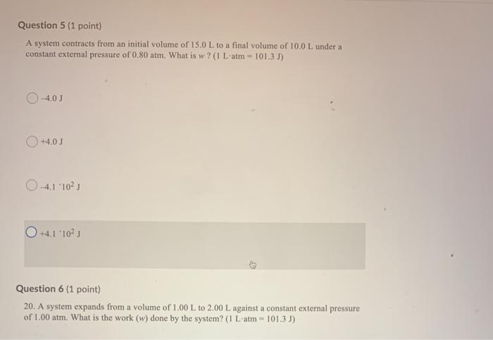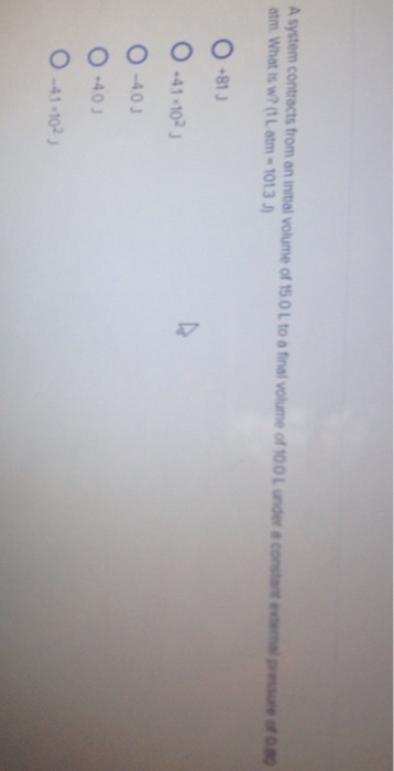 A system contracts from an initial volume of 150 L to a final volume of 100 L under a constant external pressure of 0800 atm. 30 x 10² O c30 x 10² O d. 1 L atm 1013 J 81 J 41 times 102 J -40 J -41 times 102 J.