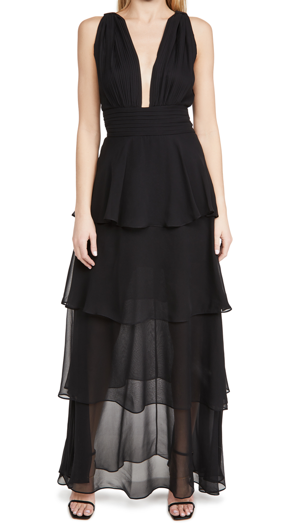 Cinq a sept Alanis Tiered Ruffle Silk Dress cinq à sept Alanis gown in a floral-print sateen Scoop neckline Shoulder straps Empire waist Tiered ruffles Maxi length High-low hem A-line silhouette Hidden back zipper Silk Lining. Laurence Tiered Silk Organza Midi Dress Ivory with Black Pearl Edge Midi length dress constructed from a delicate ivory silk organza. Cecilie Bahnsen Jade Tiered Cotton Shirt Dress - Black 1070. The dress features a mini length rounded ruffle neckline and ruffle details on the bottom hem and sleeves. No waist definition Split neck with dense shirring and tie closure Belt loops with self belt Flounced hem Unlined. Light and lustrous silk thats twisted by hand for crinkled texture. Belted metallic snake-print silk-blend chiffon midi dress. TILLY TIERED SILK DRESS. Soft Silk Sally Eagle.